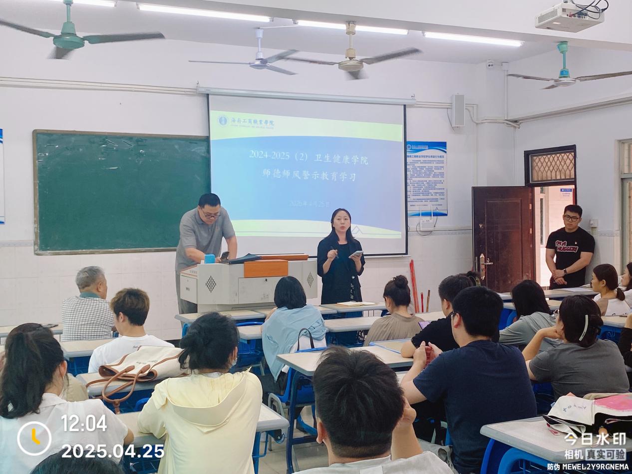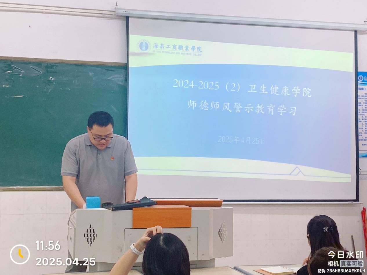 党支部书记宝晓鹏组织全体教职工开展师德师风警示教育,结合海南省教育系统典型案例,深入剖析师德失范行为的危害性,要求全体教师严守职业准则,践行 “学为人师、行为世范” 的初心使命,营造风清气正的育人环境。