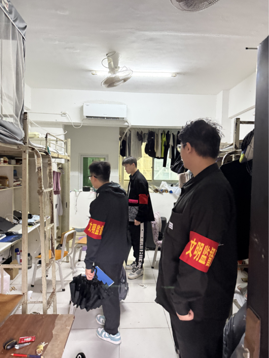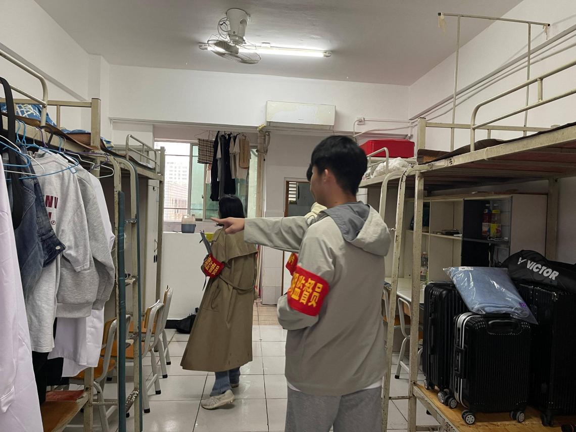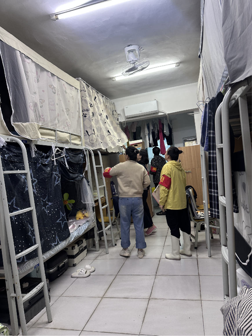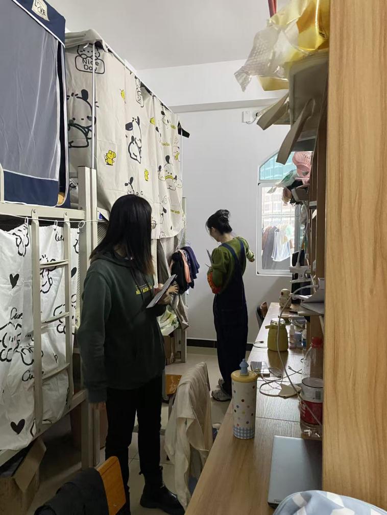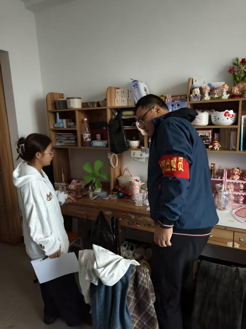 宿舍是 “三全育人” 关键阵地,更是 “一站式学生社区” 服务学生的核心场景。此次检查聚焦日常安全管理、违禁物品排查、用电安全规范,依托 “一站式学生社区” 服务模式,构建 “学院统筹、辅导员主抓、学生骨干协同” 的工作体系。检查中,小组重点查看宿舍卫生、物品摆放及通风情况,针对垃圾堆积、杂物乱摆等影响学生居住体验的问题,现场提出整改意见、明确整改时限,以 “我为学生办实事” 的务实举措解决学生住宿难题;同时结合专业特色,依托 “一站式学生社区” 育人阵地普及宿舍卫生与健康防护知识,将健康育人、安全育人与社区服务深度融合。