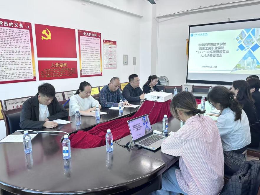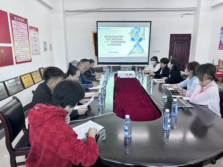 2025 年 11 月 14 日,海南工商职业学院与海南省经济技术学校 “3+2” 中高职衔接专业人才培养交流会在海南工商职业学院智慧健康学院会议室顺利召开。海南省经济技术学校一行六人来访,智慧健康学院院长刘璐、专任教师张玉霞等参加会议,围绕药品食品检验(中职)- 食品药品监督管理(高职)专业的中高职衔接工作展开深入研讨,以 “三全育人” 实践育人为核心导向,明确具体合作方向与实施方案。