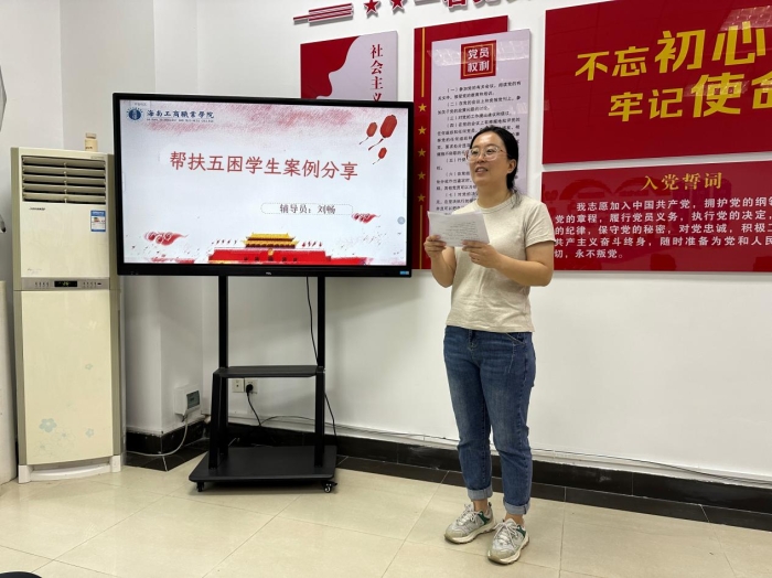 会上,辅导员刘畅以帮扶案例分享。该生因家庭劳动力不足,收入微薄,导致家庭经济困难,加上该生存在自卑敏感等问题,影响学业以及正常的生活,刘畅老师围绕学生生活、心理、行为三类问题,制定“三不三多”帮扶原则,以建立信任为前提,落实困难补助,开展私密引导与正向激励,柔性沟通家校,用陪伴与尊重助力学生转变。