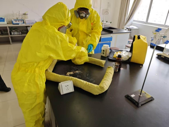 演练开始前,宝晓鹏书记结合高校实验室典型安全事故案例,详细讲解易燃液体的理化特性、泄漏及火灾事故的危害性,围绕事故预警、应急疏散、初期火灾扑救、泄漏现场处置等关键环节,对演练流程、人员分工、操作规范及安全注意事项进行全面部署。